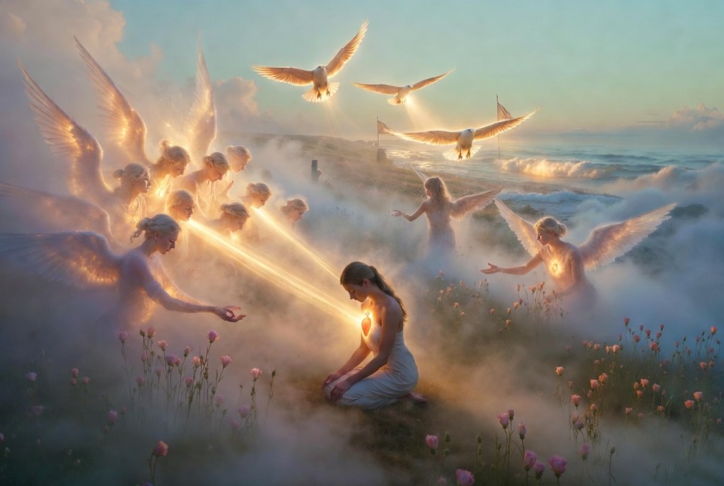 The fourth stanza introduces a moment of grace. “Mighty armies of angelic forms” gather not as forces of destruction but of protection and healing. Their strength is “gentle,” an important paradox that reflects the nature of divine intervention in this poem.