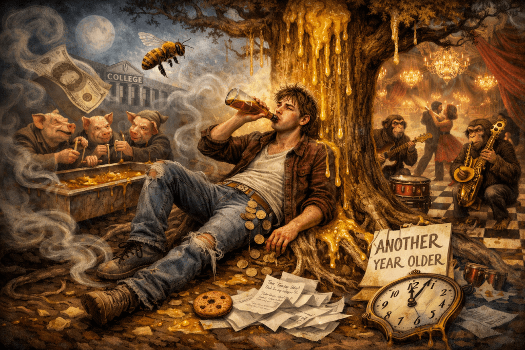 Aging here is not maturation but accumulation without growth. The subject advances in years while remaining fixed in pattern. The poem closes not with revelation but with quiet depletion, underscoring my central concern: that a life filled with motion, indulgence, and noise may still amount to stasis when it lacks awareness and discipline.
