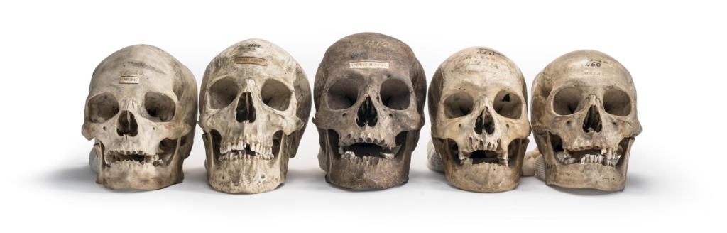 Skulls from the collection of Samuel Morton, the father of scientific racism, illustrate his classification of people into five races—which arose, he claimed, from separate acts of creation. From left to right: a black woman and a white man, both American; an indigenous man from Mexico; a Chinese woman; and a Malaysian man. —Photo by Robert Clark, Penn Museum