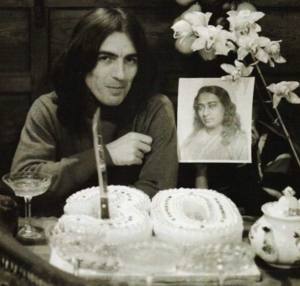 Image 2: George Harrison celebrating his 30th birthday, with photo of Paramahansa Yogananda
